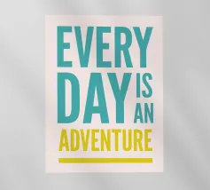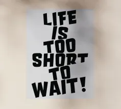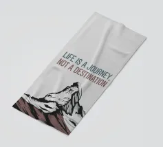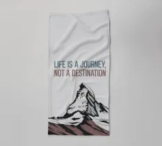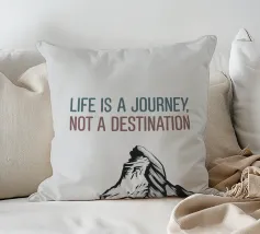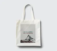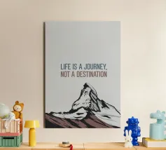 Una montagna innevata è raffigurata sotto una citazione ispiratrice che recita: "La vita è un viaggio, non una destinazione". Il design minimalista utilizza colori tenui su uno sfondo chiaro per trasmettere un senso di avventura e introspezione.