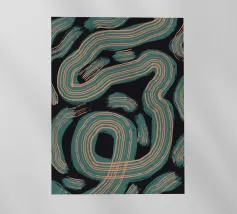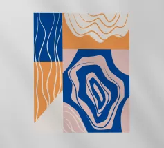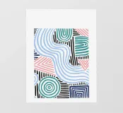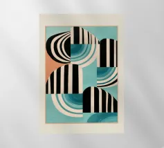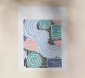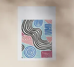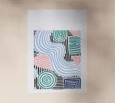 Linee curve in blu tenue scorrono tra forme grafiche in verde, blu, rosa e nero. Il vivace motivo combina un movimento giocoso con strutture chiare e disegnate a mano, creando un effetto complessivo moderno e creativo. Ideale per chi apprezza i disegni astratti, la line art ritmica e gli accenti colorati: perfetto per murales, tazze, cover per cellulari o tessuti decorativi.