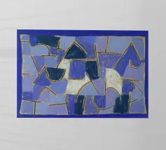 Un dipinto astratto con forme geometriche angolari e linee dinamiche in blu, marrone e arancione, che suggeriscono movimento e struttura.