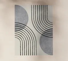 Opera d'arte geometrica che presenta una composizione di linee grigie stratificate e forme curve in una tavolozza sottile e monocromatica.
