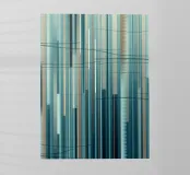 Una moderna stampa astratta di arte digitale con una composizione di linee verticali in una tavolozza di colori rilassanti di blu, verde acqua, marrone e beige tenui. Le linee variano in larghezza e tono, creando un senso di profondità e ritmo, mentre le linee orizzontali sottili e ampie aggiungono un contrasto dinamico. Questo pezzo evoca una sensazione di calma e raffinatezza, rendendolo un'aggiunta perfetta a spazi abitativi contemporanei, uffici o camere da letto.