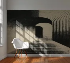 Incisione in bianco e nero di un arco con scale e un lungo sentiero curvo davanti ad esso. La texture ricorda un tappeto o un arazzo, le linee sottili creano riflessi di luce. Atmosfera misteriosa e invitante, come se il sentiero conducesse a un altro mondo.