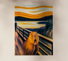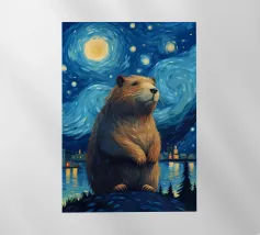 Scoprite una stravagante tela d'arte con un sereno capibara che tiene in mano una vibrante rosa rossa, su uno sfondo da sogno ispirato alla notte stellata. Questo design unico fonde surrealismo e natura, rendendolo un pezzo d'arredamento perfetto per gli amanti degli animali e gli appassionati d'arte. Ideale per aggiungere fascino ed eleganza a qualsiasi spazio o come regalo per i fan del capibara.