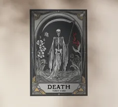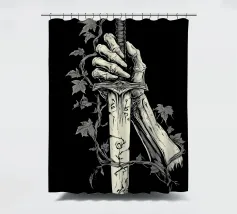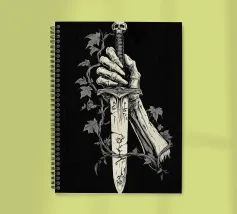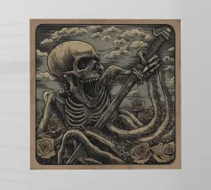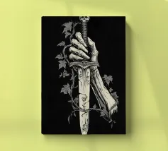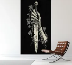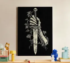 Uno scheletro ossuto impugna una spada con incisioni mistiche che si intreccia con viticci e foglie. Lo sfondo cupo rafforza l'impressione di una scena tratta da una fantasia oscura o da un mito gotico. La spada sembra essere non solo un'arma, ma anche una reliquia di un potere passato. Questa opera d'arte dettagliata combina l'estetica horror con il simbolismo medievale ed è particolarmente adatta agli appassionati di mondi fantasy oscuri, estetica metal o temi occulti. Ideale per stanze d'atmosfera, aree di gioco o come elemento d'impatto in stili di vita alternativi.