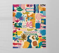Questo disegno presenta una composizione astratta di linee e forme fluide in colori vivaci. Gli elementi sono disposti in modo armonioso e conferiscono al disegno un aspetto dinamico e giocoso.