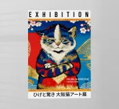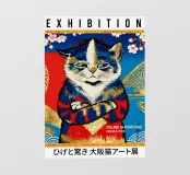 Un'illustrazione d'arte popolare vibrante e stravagante di un gatto blu con occhi ampi e incantevoli. Ispirato alla mostra di arte felina di Osaka, questo pezzo cattura lo spirito giocoso dei felini con i suoi intricati motivi simili a merletti e il suo stile espressivo.