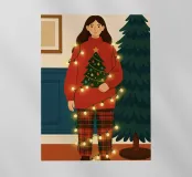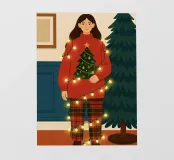 Donna a casa che decora il suo albero di Natale. Le luci natalizie sono aggrovigliate intorno al suo corpo.