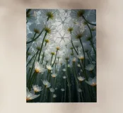 Questo incantevole pezzo cattura una vista mozzafiato, a occhio di verme, di un campo fantastico dove fiori bianchi e traslucidi con delicati petali a ventaglio si protendono verso il cielo. I fiori eterei, che ricordano dente di leone o giglio, sono illuminati dall'interno e proiettano una luce calda e dorata che crea un'atmosfera magica e onirica. Sotto gli steli si intravede un rigoglioso e verdeggiante suolo forestale, che ancorano la scena ultraterrena a un senso di meraviglia naturale. La composizione attira lo sguardo verso l'alto, in direzione di un baldacchino radioso, simile a una stella, che suggerisce una meraviglia celeste o architettonica che funge da sfondo.