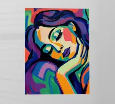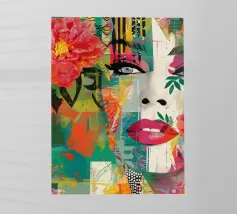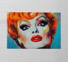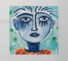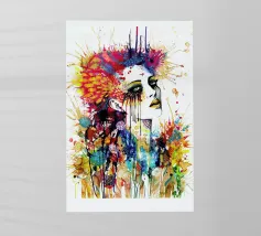Un suggestivo ritratto di donna il cui volto è ornato da vistose macchie di vernice rossa e blu, con un effetto di sgocciolamento, su uno sfondo vibrante, astratto e colorato.
