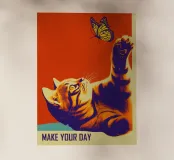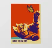 Questo affascinante poster motivazionale combina una fotografia giocosa con un'estetica vintage. L'intensa combinazione di colori bicolore, arancione brillante e viola intenso, ricorda le serigrafie psichedeliche degli anni Sessanta. Il gatto curioso che raggiunge la farfalla monarca simboleggia la gioia infantile e l'esperienza consapevole. Lo slogan "MAKE YOUR DAY" sottolinea il messaggio positivo senza essere invadente. L'elaborazione dell'immagine in formato poster conferisce all'opera una chiarezza grafica. Una dichiarazione sulla gioia di vivere, sulla curiosità e sulla ricerca della felicità nei piccoli momenti - ispiratrice e decorativa.