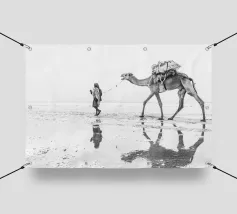 Uomo con il suo cammello. Uomo Afar che cammina nella depressione di Danakil, in Etiopia. Camminare verso un lago salato nel caldo del deserto.