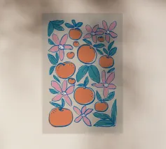 Aggiungete un'esplosione di fascino succoso e agrumato al vostro spazio con questa illustrazione audace e giocosa di vibranti mandarini. I frutti di colore arancione brillante, le foglie blu intenso e lo sfondo rosa tenue creano un contrasto moderno e accattivante che irradia calore ed energia. Questo motivo contemporaneo di frutta è perfetto per gli amanti dei disegni freschi e allegri e dell'estetica mediterranea.