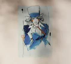 Marlene Dietrich con cappello, sigaretta e blazer, o giacca. Disegno rosso-blu, biro su carta.