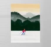 Un tranquillo momento invernale dall'eleganza minimalista: una singola persona scivola sugli sci attraverso un paesaggio innevato, mentre sullo sfondo colline verdi e un cielo morbido e dorato garantiscono calma ed equilibrio. Questo disegno cattura la bellezza pacifica di una limpida mattina d'inverno - minimalista, armonioso e moderno. Perfetto per gli amanti delle scene tranquille e dell'estetica nordica.