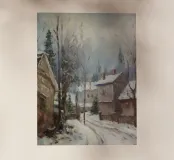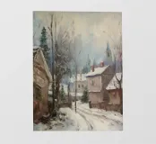 Una pittoresca mattina d'inverno in un tranquillo villaggio: le case coperte di neve, gli alberi slanciati e le lontane guglie delle chiese si stagliano dolcemente nella luce bluastra. Il sentiero tra la neve conduce l'occhio attraverso il tranquillo scenario ed evoca ricordi di tranquille giornate invernali. Il dipinto unisce nostalgia, tranquillità e bellezza naturale in colori armoniosi e pennellate raffinate.