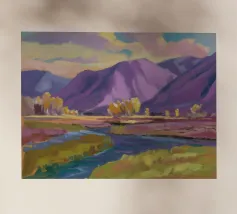 Un dipinto paesaggistico espressivo raffigura un fiume che serpeggia in una valle con alberi dalle tonalità autunnali o crepuscolari di rosa, arancione e viola, sotto un cielo drammatico e colorato, che evoca una scena lunatica e vibrante.