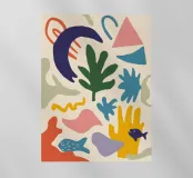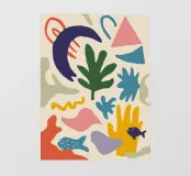Una composizione astratta stravagante e onirica con un serraglio di forme che suggeriscono mani, pesci, foglie e una luna crescente. L'opera d'arte è fantasiosa, giocosa e ha una qualità delicata e fiabesca.