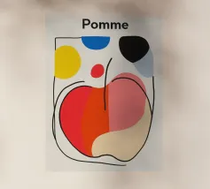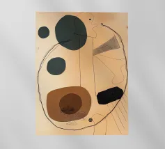 Linee e forme astratte creano una composizione minimalista dai colori tenui, con contorni neri decisi che definiscono le forme organiche. Uno sfondo chiaro esalta il contrasto tra i toni della terra e i tenui colori pastello.