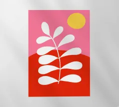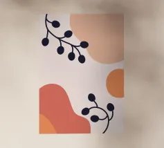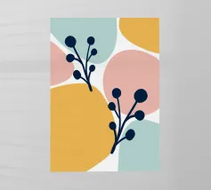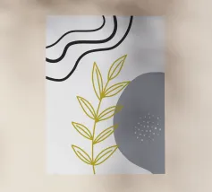 Un disegno botanico minimalista presenta un ramo bianco delineato con foglie. Linee curve e forme organiche nei toni del blu, del verde e del giallo creano uno sfondo moderno e astratto.