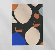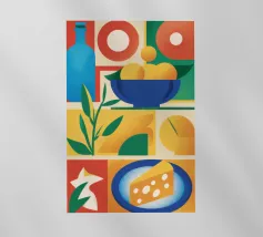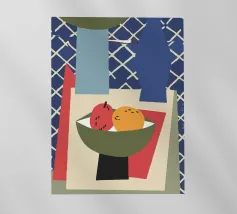 Una composizione minimalista presenta una ciotola con due frutti rossi su uno sfondo a motivi geometrici. I colori vivaci e le forme astratte creano un'immagine moderna e di grande impatto.