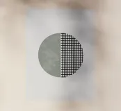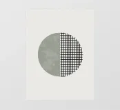 Opera d'arte geometrica minimalista con linee nere e una forma rotonda in verde salvia e texture su sfondo beige.