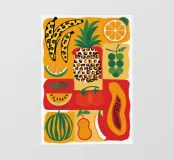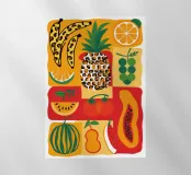 Una composizione vivace e generosa di vari frutti tropicali stilizzati come ananas, papaya e anguria. L'opera d'arte è una celebrazione colorata e gioiosa delle dolci offerte esotiche della natura.