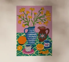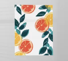 Un vivace motivo grafico di fette d'arancia ripetute su uno sfondo a strisce bianche e arancioni. La composizione è fresca, saporita, moderna e un'allegra celebrazione degli agrumi.