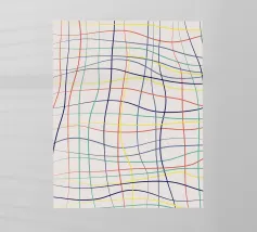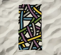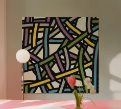 Una varietà di linee spesse e sottili si incrociano e si sovrappongono su uno sfondo chiaro, creando un disegno intricato. Segmenti colorati nei toni del blu, del verde, del giallo e del viola aggiungono un vibrante contrasto alle linee nere.