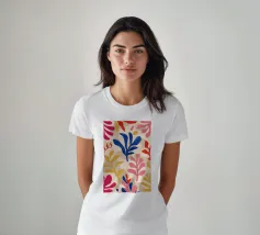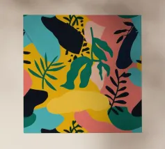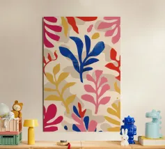 Un motivo vivace e senza soluzione di continuità di foglie stilizzate e forme botaniche in una tavolozza di rosso, blu, rosa e giallo, che crea un senso di movimento ritmico e naturale.