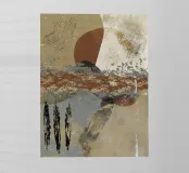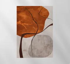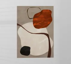 Moderna opera d'arte astratta con forme, linee e texture nei caldi toni della terra: marrone, ruggine, grigio e beige.