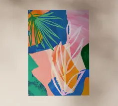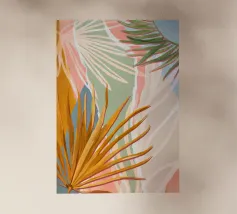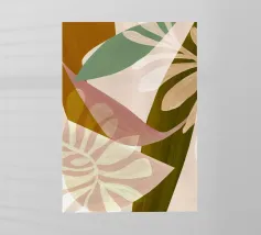 L'opera presenta una luminosa e moderna stampa astratta di foglie, composta da blocchi di colori ricchi e vibranti dipinti a mano. È stratificata con forme di foglie in una composizione a collage.