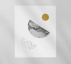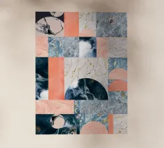 Una composizione moderna presenta un mix di motivi di marmo, granito e terrazzo, intersecati da una sottile linea orizzontale dorata. Le forme geometriche creano un'estetica strutturata e architettonica con toni e texture contrastanti.
