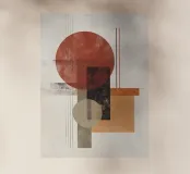 Un'audace opera d'arte astratta con cerchi, rettangoli e linee sottili in rosso ruggine, nero, beige e arancione. La finitura strutturata conferisce un tocco vintage, rendendola ideale per interni moderni, boho o di metà secolo.
