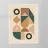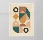 Un'opera d'arte astratta di forme geometriche nei toni del verde terra, dell'arancio e del beige, disposte con equilibrio su uno sfondo chiaro e strutturato.