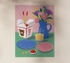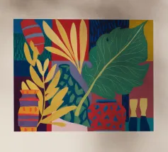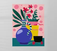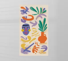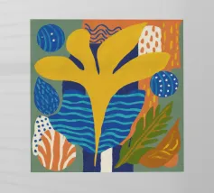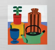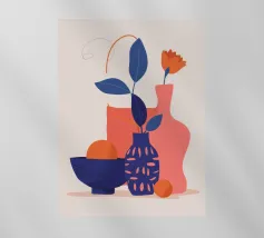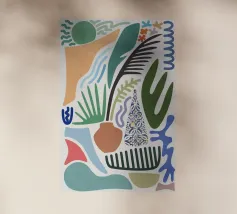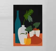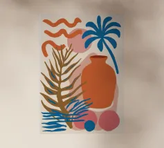 Una moderna natura morta astratta con una pianta stilizzata in un vaso blu, un croissant e forme organiche sotto un sole giallo, il tutto in una composizione equilibrata e calda.
