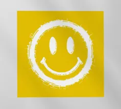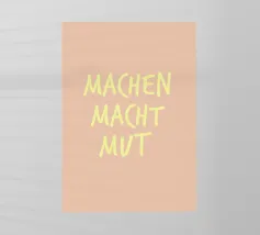 Questo design creativo ed energico combina una tipografia semplice con un messaggio positivo. Su uno sfondo giallo caldo, la scritta "MO IN" spicca in caratteri maiuscoli bianchi e decisi. Direttamente sotto di essa, "DU PACKST DAS" è disposta in una linea curva e semicircolare che ricorda visivamente un sorriso.