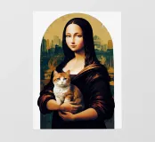 Una rivisitazione creativa del classico capolavoro, con Monna Lisa che tiene delicatamente in braccio un gatto. Un mix giocoso di arte senza tempo e immaginazione moderna.