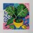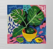 Una vivace natura morta di una pianta di monstera in un vaso giallo, su uno sfondo di motivi astratti e colorati. La composizione è un mix vivace e giocoso di forme naturali e design moderno.