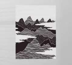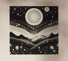 Questa stampa in bianco e nero in stile linoleografia ritrae un ipnotico paesaggio notturno. Una luna piena splendente domina il cielo stellato, proiettando la luce su un fiume tortuoso che scorre tra montagne aspre e strutturate. L'intricato lavoro al tratto crea un senso di movimento e profondità, evocando mistero e tranquillità.
