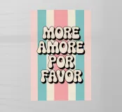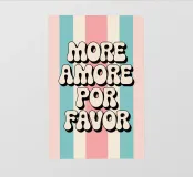 Poster vettoriale retro groovy con la scritta "More Amore Por Favor". Sfondo a strisce in rosa pastello, blu e crema, abbinato a una tipografia anni '70 per un design retrò giocoso e colorato.