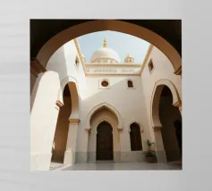 Architettura marocchina. Arco in un edificio in Marocco. Edificio bianco e beige con ombra sul muro. Architettura tradizionale con decorazione.