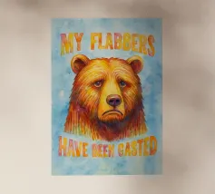 Un gatto cartoon con un'espressione sorpresa è circondato dalla frase umoristica "My Flabbers Have Been Gasted" (Le mie chiappe sono state gonfiate) in grassetto, a caratteri arancioni.