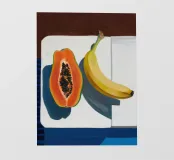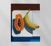 Una natura morta realistica ma stilizzata di una papaya e una banana su una superficie bianca, immersa in una forte luce solare diretta. Il gioco di luci e ombre lunghe crea una composizione drammatica e moderna.
