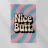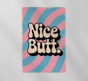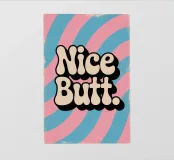 Poster vintage con la scritta "Nice Butt" in grassetto tipografico. Lo sfondo rosa e blu con motivi colorati e vorticosi, la texture giocosa e l'effetto serigrafico retrò creano un design vivace, spiritoso ed elegante con un look vintage.