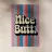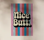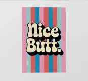 "Nice Butt." in caratteri grandi e decisi su uno sfondo a righe. Il rosa e l'azzurro pastello creano un'atmosfera elegante e giocosa: un design colorato e spiritoso con una tipografia moderna.