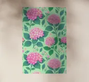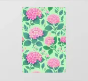 Elegante motivo floreale con fiori di ortensia rosa chiaro e foglie verdi su sfondo verde menta.