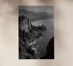 Catturate l'aspra bellezza di una costa nebbiosa con questa suggestiva opera d'arte in bianco e nero, caratterizzata da iconici faraglioni e onde che si infrangono. Perfetto per aggiungere un tocco potente e drammatico a qualsiasi spazio.