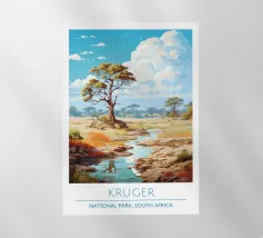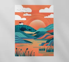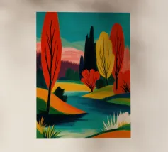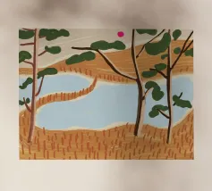 Raffigura un paesaggio tranquillo con uno specchio d'acqua in primo piano. Erbe alte e canne costeggiano l'acqua. Al centro, alberi dal tronco rosato e dal fogliame verde. Lo sfondo è caratterizzato da colline ondulate nei toni dell'arancione, del giallo e del verde, con un cielo blu e nuvole bianche in alto.