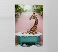 Un simpatico panda si sta godendo un bagno, circondato da schizzi e bolle. La scena si svolge in un bagno con piastrelle color verde acqua e una barra da bagno in legno.