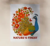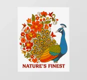 Una lussureggiante illustrazione di un pavone e di un bouquet di fiori rosso-arancio. Una tavolozza calda ed estiva, ideale per creare un'atmosfera botanica e di tendenza nella vostra casa.